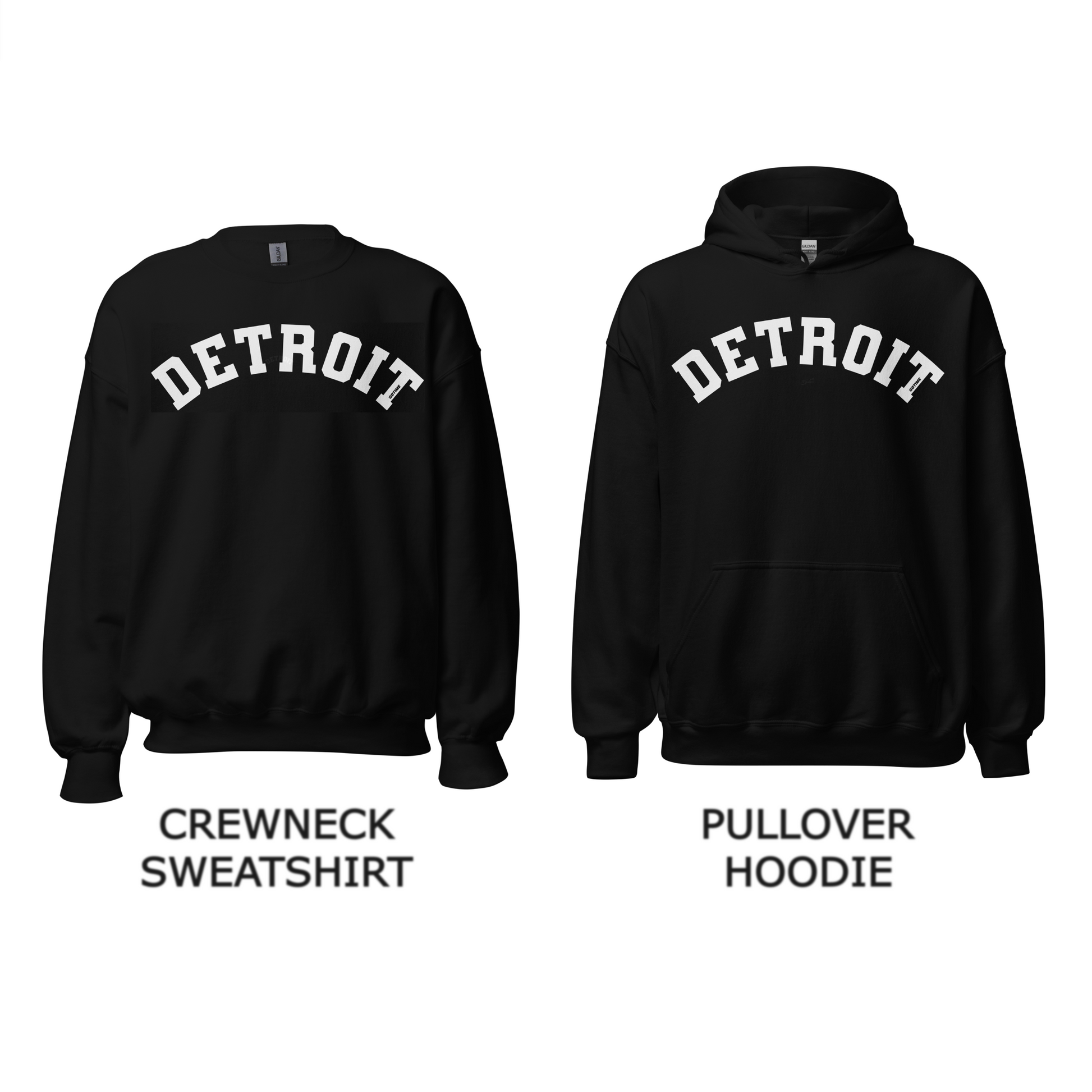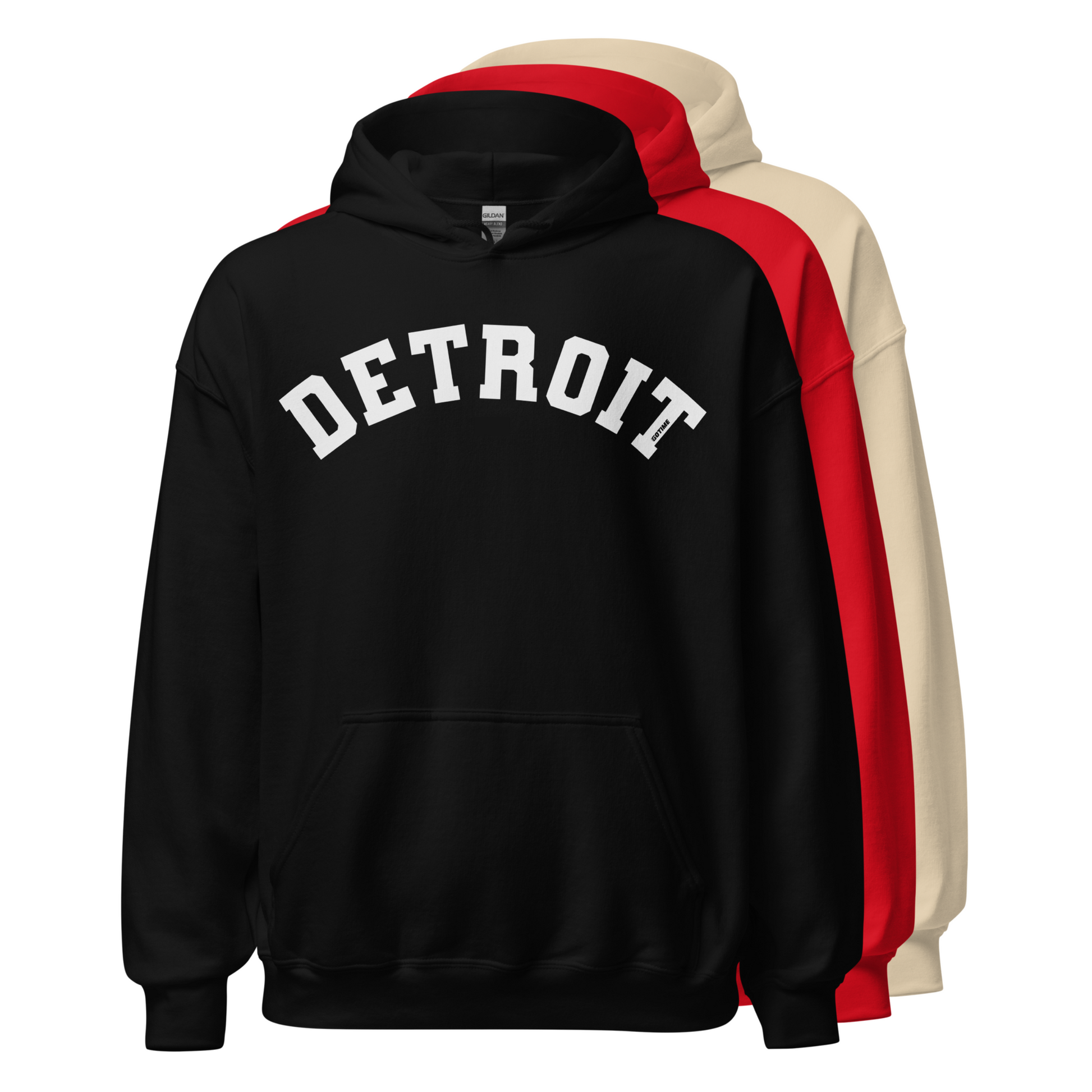 Rep The Motor City with this stylish, retro Detroit hoodie sweatshirt featuring a classic Detroit arch design in vintage block letters. Available as a unisex sweatshirt or pullover hoodie, it's cozy and warm and an excellent choice for those who love Detroit sports or anyone from Detroit, MI.