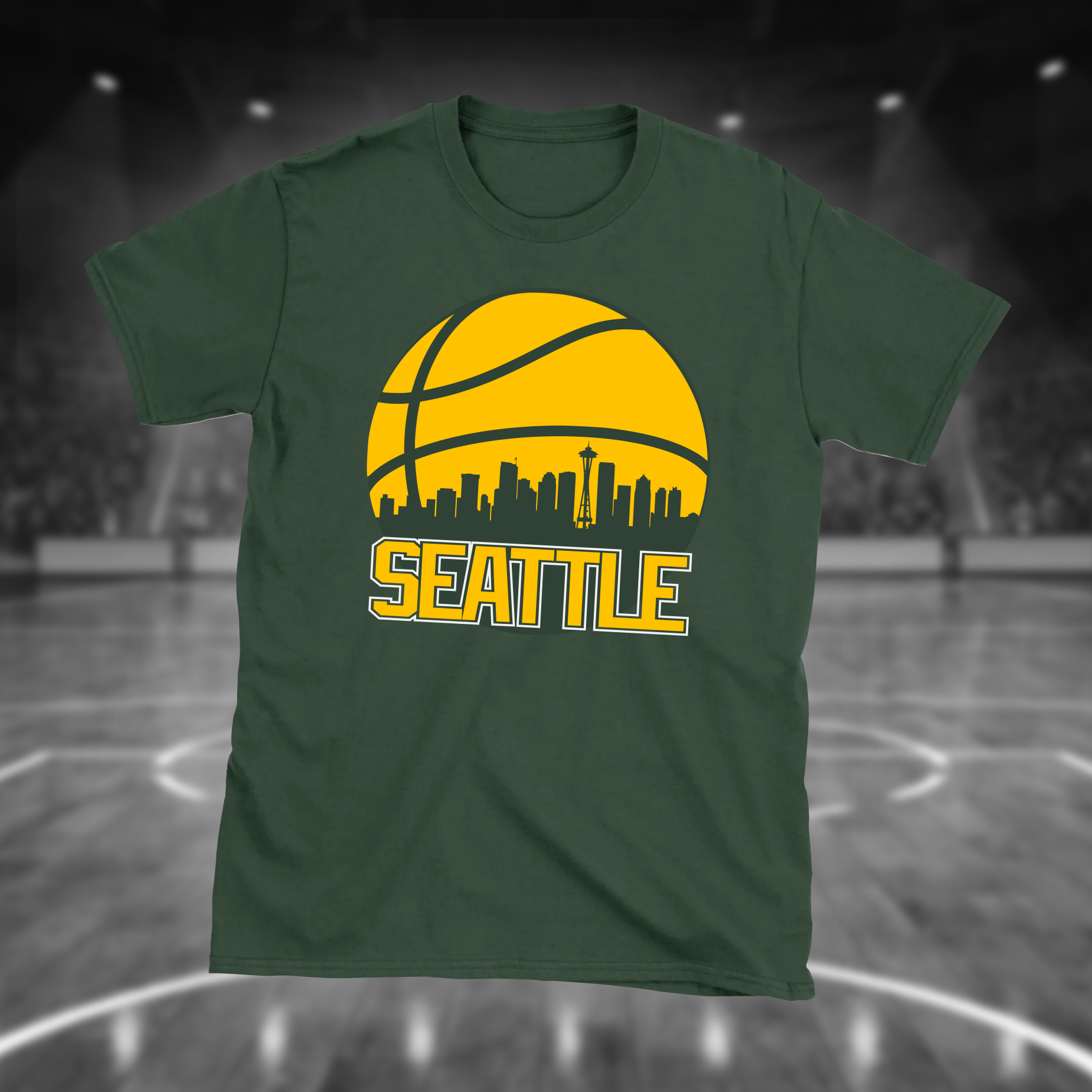 Designed for basketball fans who love Seattle, this retro Seattle basketball shirt is sure to be a winner with dedicated followers of Sonics basketball and anyone who is from Seattle, WA. Features a retro Seattle basketball design with a silhouette of the city skyline.
